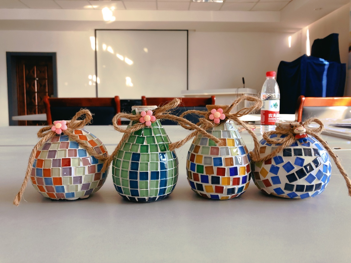 在活动开始前,工作人员介绍了马赛克花瓶的制作流程和注意事项。随后,大家认真而专注的制作起马赛克花瓶,运用自己的创作灵感,根据自己的思路把一颗颗马赛克贴到木质花瓶的表面,构成自己想要的图案。之后还要给缝隙填上粘贴剂,抹平。经过一个多小时,大家创意出来的花瓶渐渐地呈现在眼前,每个花瓶都是每个人的创意表现。