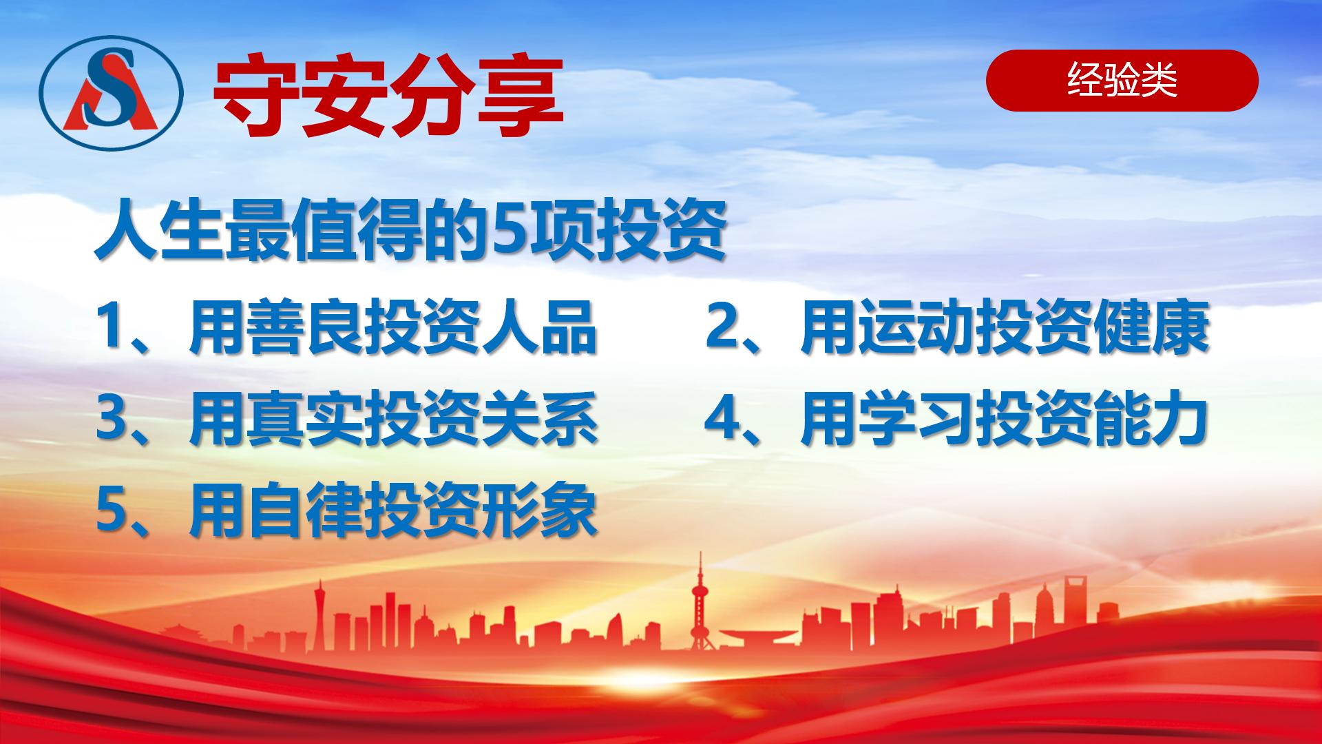 人生最值得的5项投资: 1、用善良投资人品 2、用运动投资健康 3、用真实投资关系 4、用学习投资能力 5、用自律投资形象