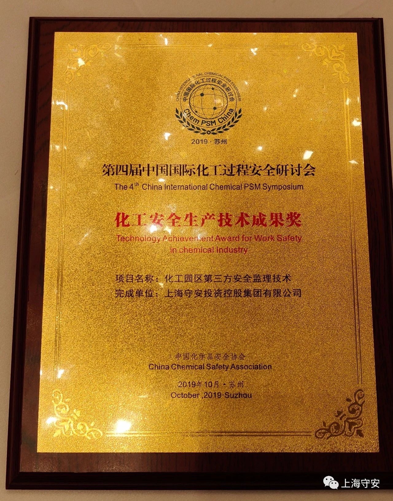 在第四届中国国际化工安全技术与装备展览会上,上海守安荣获“化工安全生产技术成果奖”。