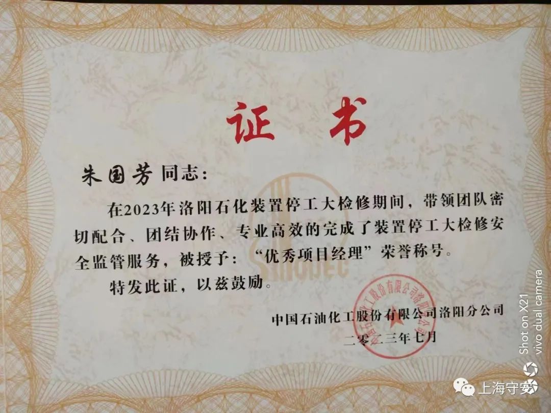 凝心聚力写新篇,砥砺奋进创一流。在上海守安洛阳石化检修团队全体成员的共同努力下,以高度的责任心、高尚的职业道德水准、出色的工作业绩赢得业主和公司的认可,被业主方授予团队荣誉 “金牌第三方”,朱国芳经理荣获“优秀项目经理”称号。