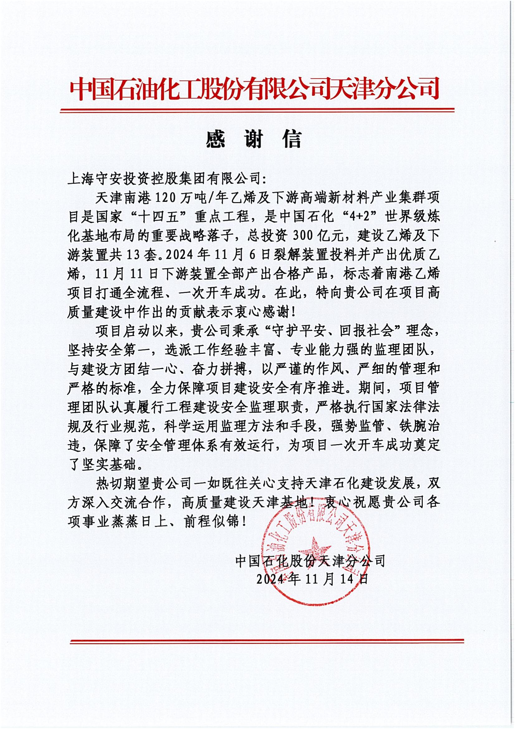 近日,上海湾区高新区园区安(环)委员会、山东临朐县化工产业发展服务中心、中国石油化工股份有限公司天津分公司、中国石油化工股份有限公司九江分公司等对我司各服务团队的工作给予了高度评价。