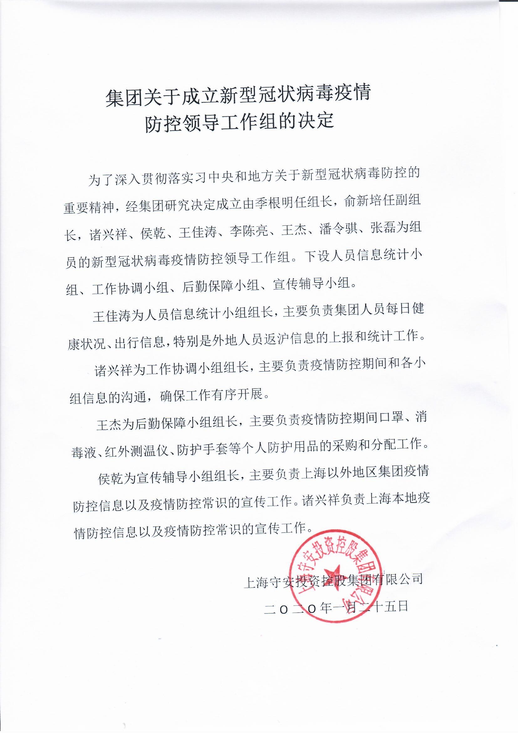 为了深入贯彻落实中央和地方政府关于新型冠状病毒防控的重要精神,切实做好疫情防控工作,集团领导思想高度重视,第一时间成立了疫情防控工作领导小组,集团董事长季根明亲自任组长,总经理俞新培任副组长,下属各公司主要负责人任组员,领导集团开展疫情防控工作。