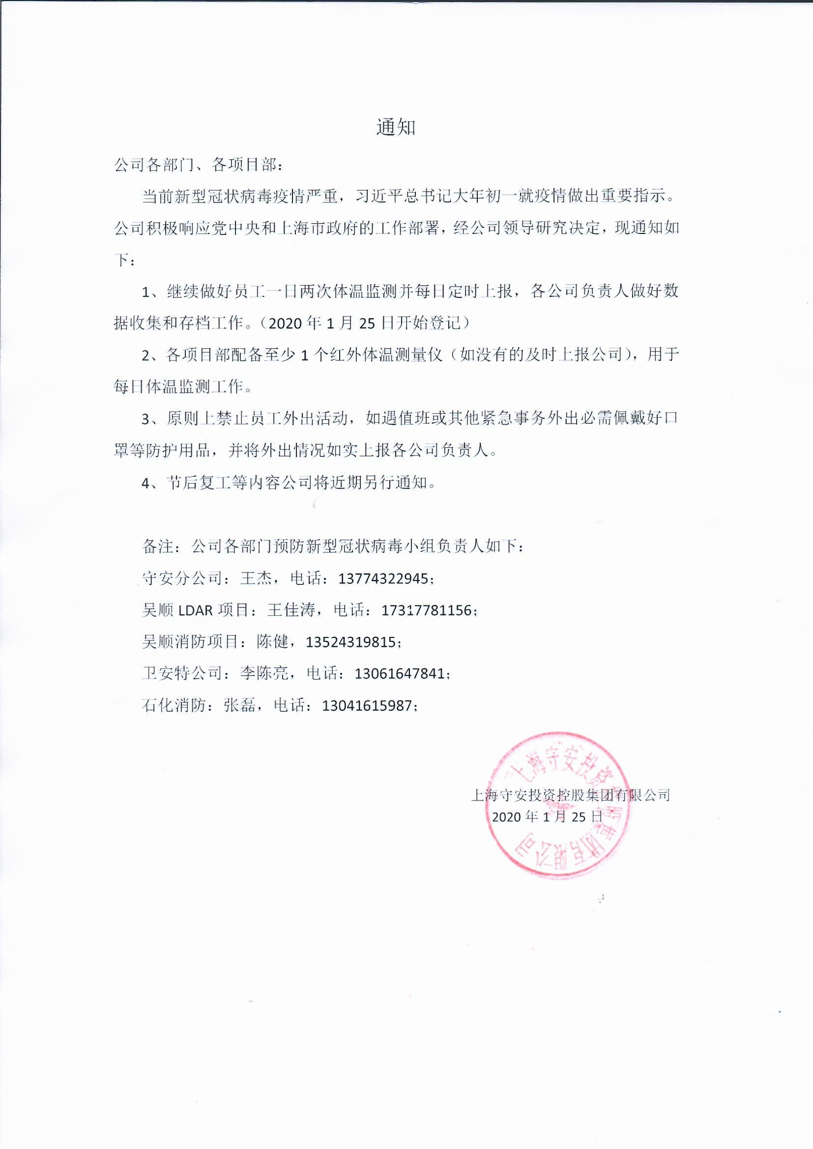 新型冠状病毒疫情爆发以来,党中央和地方各级政府高度重视,积极开展疫情防控工作。守安集团思想重视、行动迅速,众志成城、积极防控。1月25日以来,主要做了以下工作: