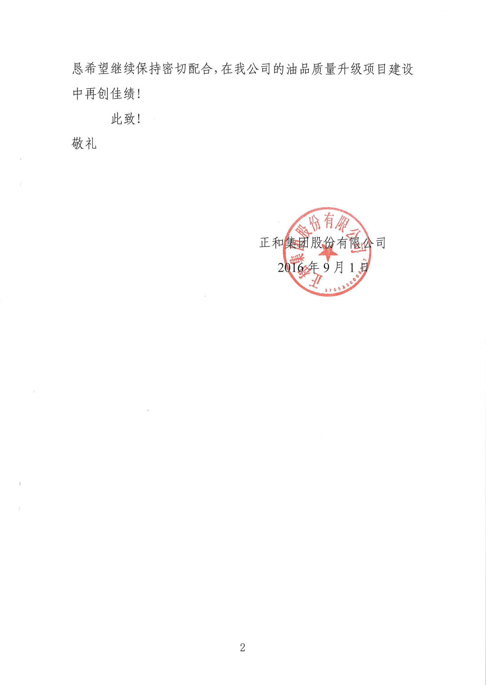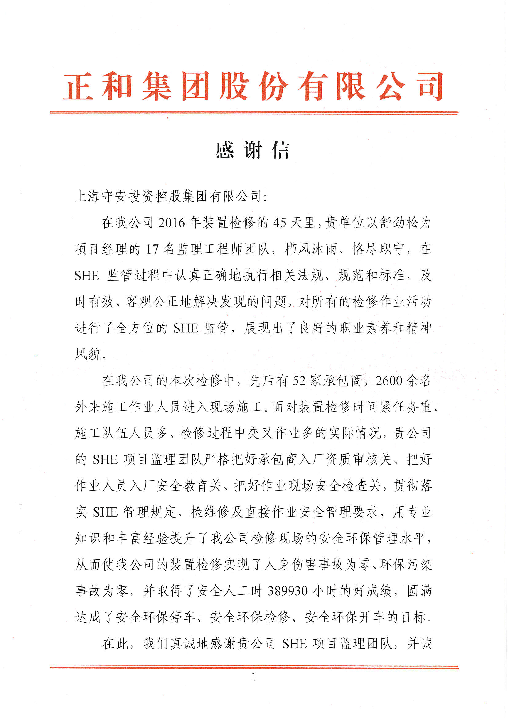 9月23日,山东正和集团股份有限公司寄来了感谢信,感谢公司派遣的山东团队在装置检修的45天时间内栉风沐雨,恪尽职守的工作,用专业的知识和丰富的经验提升了检修现场的安全环保管理水平,实现了零事故,取得了389930小时的安全人工时的好成绩,并表示希望继续保持密切配合,在油品质量升级项目建设中再创佳绩!