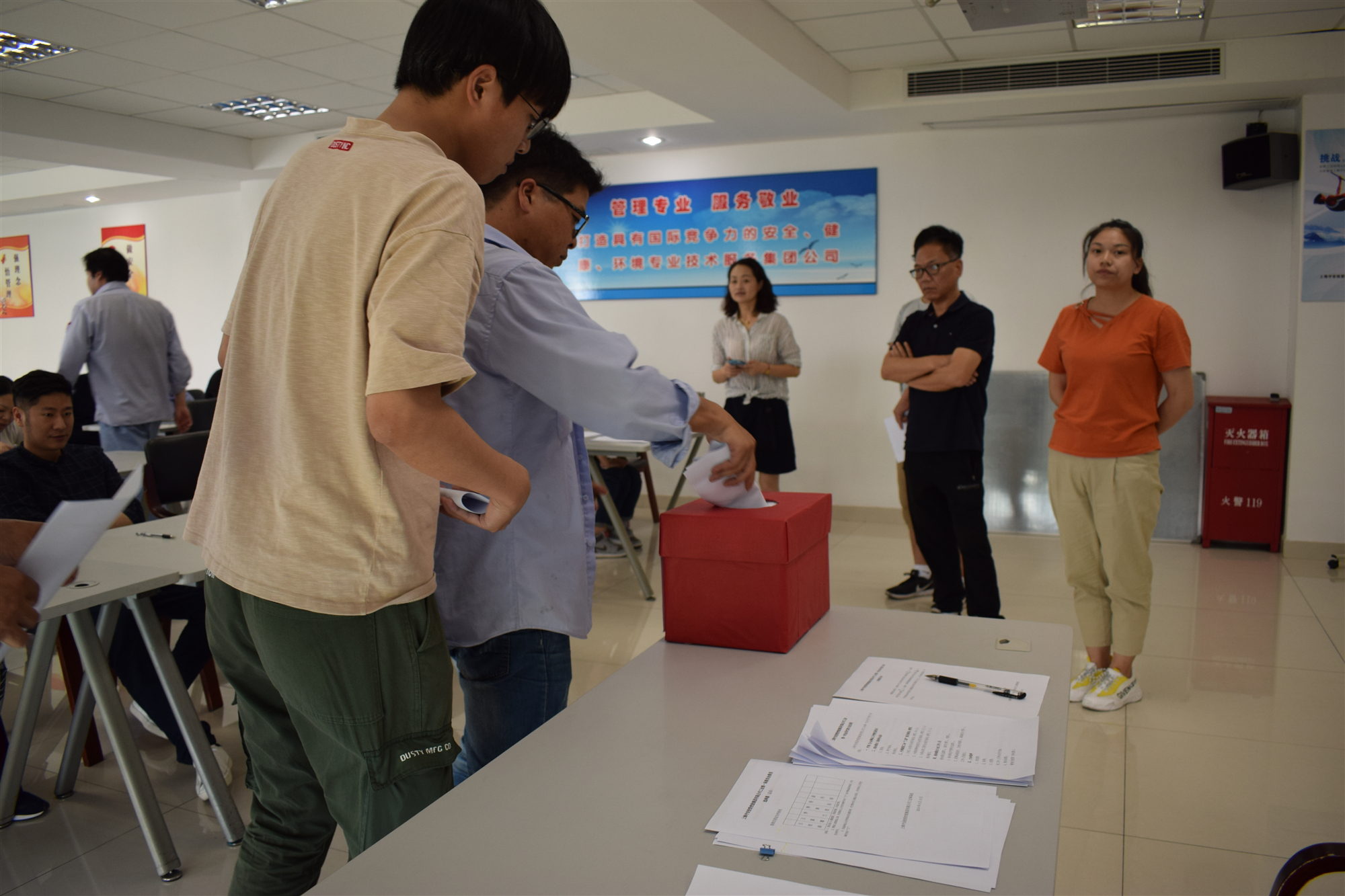大会应到代表37名,实到33名,在监票人员的监督下,大会选举工作顺利进行,选举有效,诸兴祥、王佳涛、王嘉雄、李兰、季奔浩5位同志当选为上海守安投资控股集团有限公司工会第一届委员会委员,诸兴祥同志为主席,王佳涛同志为副主席;张金萍、陈彬、潘令骐3位同志当选为工会第一届经费审查委员会委员,张金萍同志为主任;李兰、张宏茹、倪伟艳3位同志当选为第一届女职工委员会委员,李兰同志为主任。
