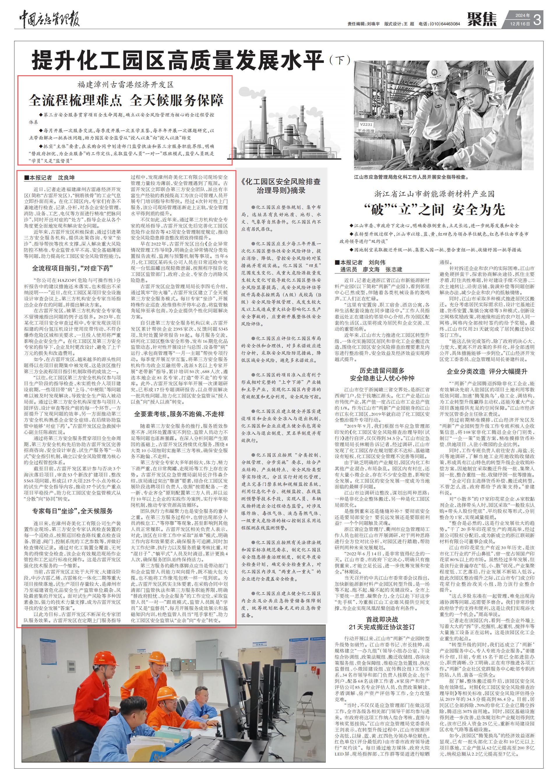 中国应急管理报于2024年12月16日刊登题为《全流程梳理难点 全天候服务保障》报道我公司在福建漳州古雷经济开发区的安全第三方先进服务模式。
