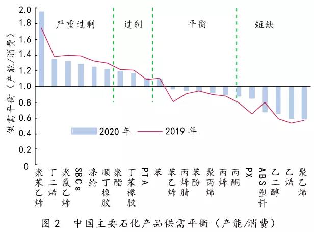 据国内石化产能建设情况,2019—2020年乙烯、丙烯产能增加近 1200×104 t/a,聚烯烃、PX、PTA(精对苯二甲酸)增加超过 1000×104 t/a,乙二醇、苯乙烯增加约 500×104 t/a,纯苯、聚酯增加约 400×104 t/a,进一步提高国内供应能力,并引起供需平衡变化。据国内主要石化产品产能和消费比,主要原料于平衡或短缺状态,乙烯、聚乙烯、聚丙烯和 ABS 塑料缺口较大,合纤、橡胶持续过剩,聚苯乙烯、聚氯乙烯和聚酯等产品已严重过剩(见图 2)。