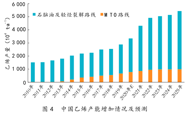 随着 2019 年新浦化学 65×104 t/a 乙烯产能、2020 年盘锦宝来 100×104 t/a 乙烯产能陆续建成投产,除 CTO、MTO 外,中国又新增轻烃裂解原料路线生产乙烯,原料多元化发展趋势显著。2021 年前后将有包括中国西北地区 2 套乙烷裂解装置在内的5 套乙烷和轻烃裂解制乙烯装置投产。此类装置产能规模合计将达 590×104 t/a。从乙烯工艺路线上看,未来还有外商独资原油直接裂解制烯烃新建产能,中国乙烯产业已进入多元化发展和竞争的格局。2019 年,中国乙烯产能达 2884×104 t/a,其中石脑油及轻烃裂解路线乙烯产能 2206×104 t/a(含催化裂解制乙烯产能 60×104 t/a),MTO 路线乙烯产能 678×104 t/a。预计 2020 年和 2025 年中国乙烯产能将分别达 3348×104 t/a和 5438×104 t/a (见图 4)。