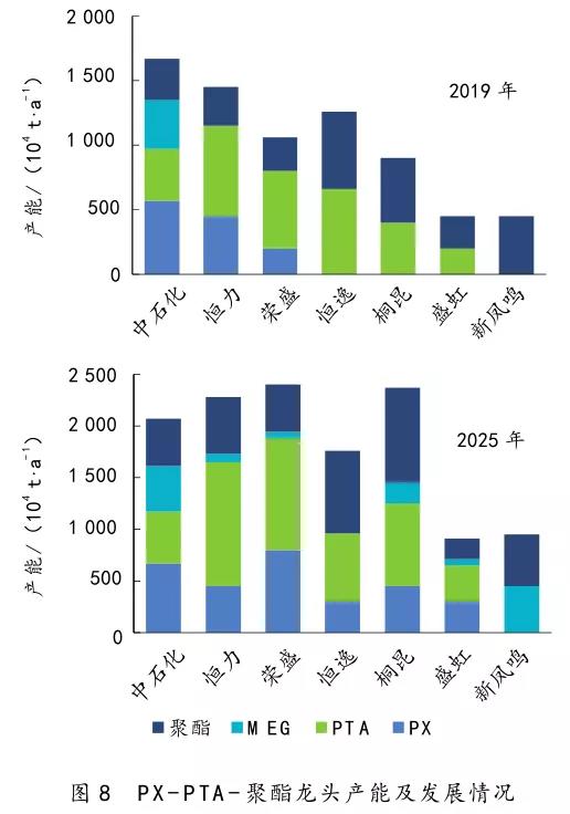 目前,国内 PX 总产能 2219×104 t/a,共计 20家企业。其中,具有配套上游的企业有 18 家,占全国产能的 95% ;具有配套下游的企业有 9 家,占全国产能的 60% 。产业链高度集中,市场竞争异常激烈。到 2025 年,恒力、荣盛、恒逸、桐昆及新凤鸣等聚酯龙头企业正向 PX 及 MEG(乙二醇)发展,旨在继续做大做强化纤产业链,深入产业链上下游,进一步加强产业集中度(见图 8)。