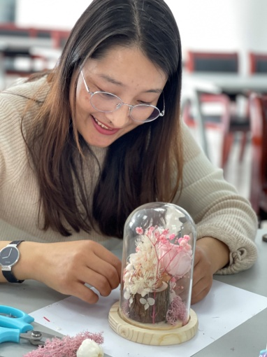 经过1个小时的实践,大家手捧完成的永生花玻璃罩作品,脸上都洋溢着喜悦的笑容。