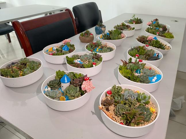 职工们经过填土、配色、种植、装饰,一会功夫,一盆盆极具故事色彩的多肉盆栽呈现出来,每个人脸上都洋溢着满意的笑容。