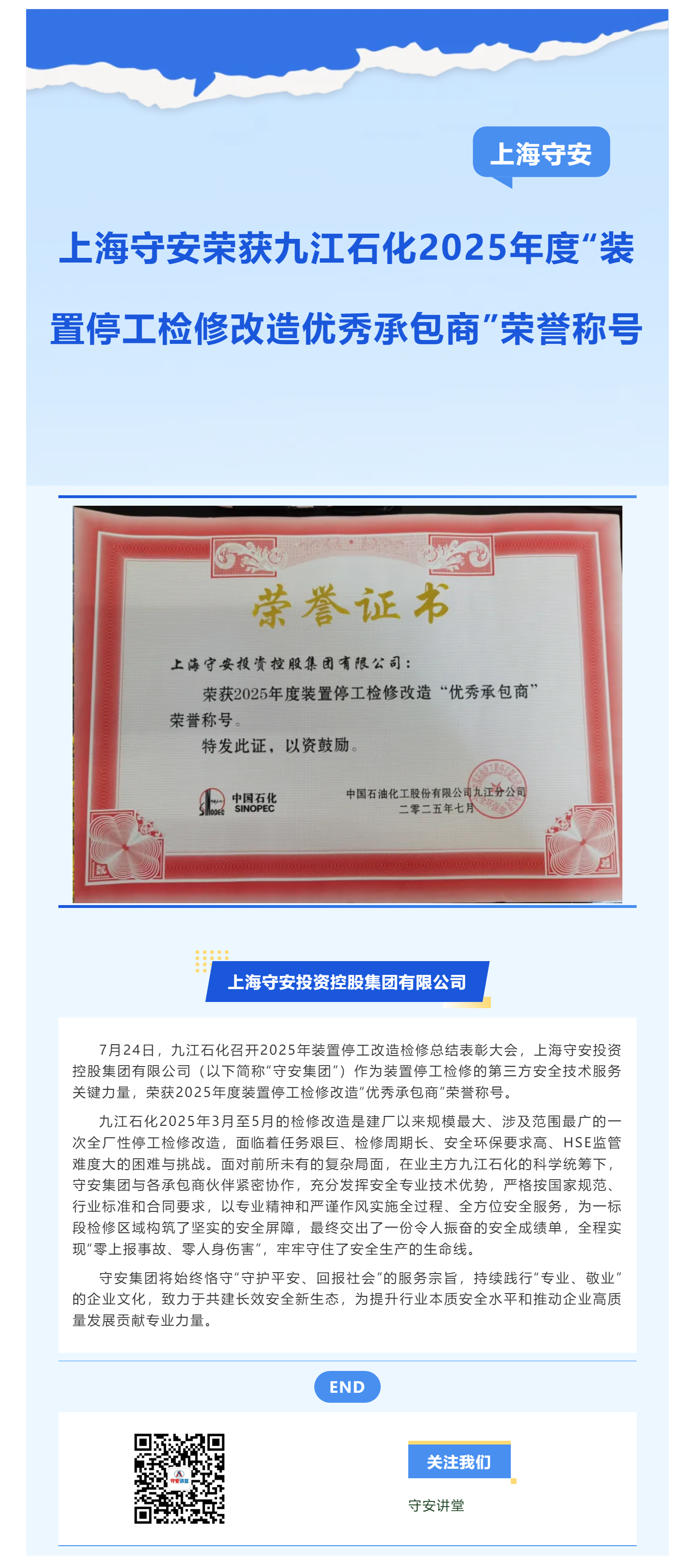 上海守安荣获九江石化2025年度“装置停工检修改造优秀承包商”荣誉称号