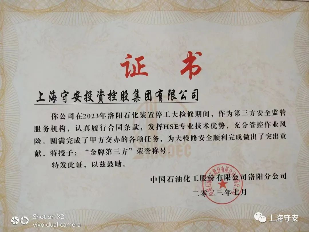 热烈祝贺!上海守安洛阳石化检修团队荣膺“金牌第三方”等荣誉