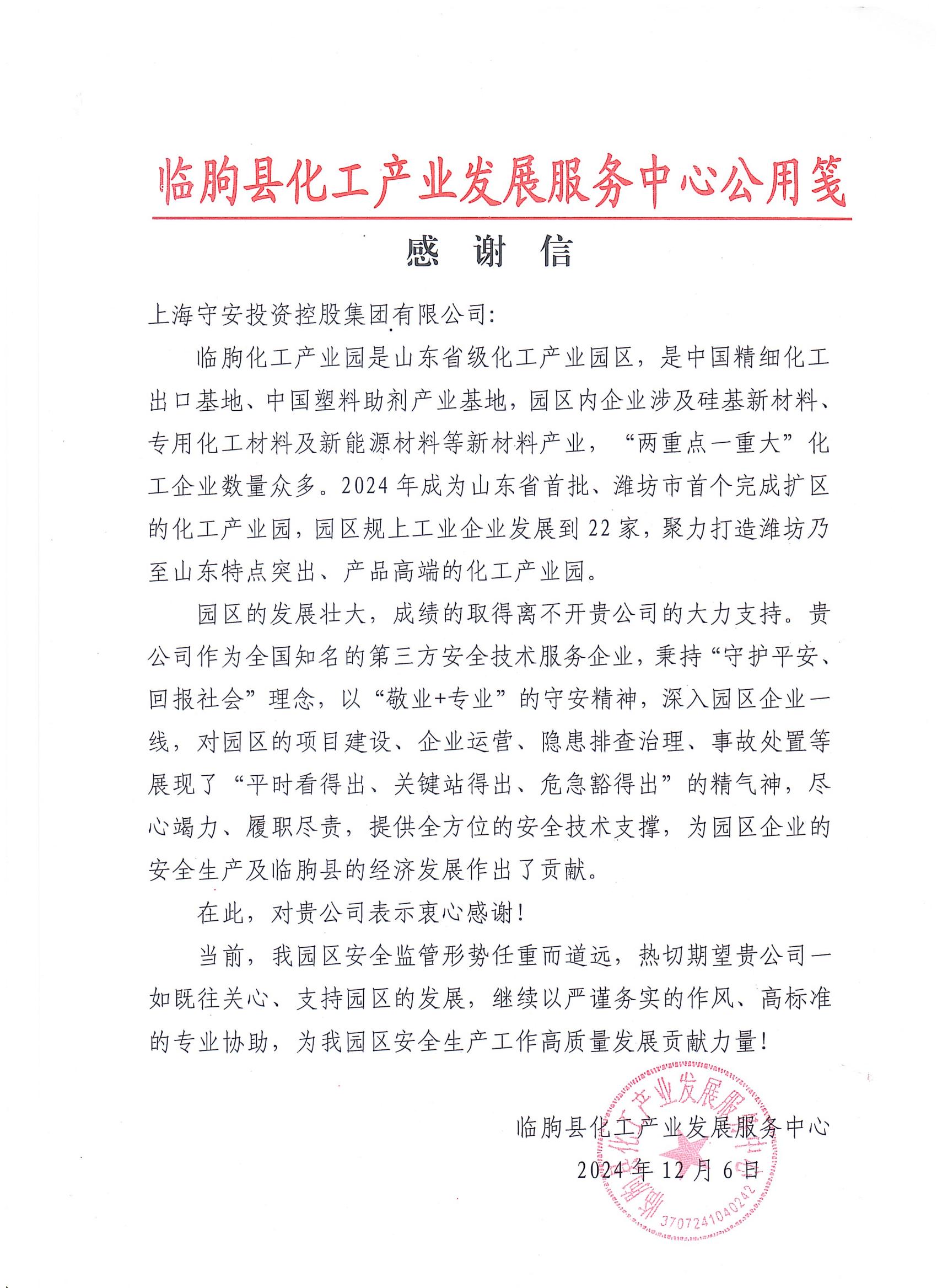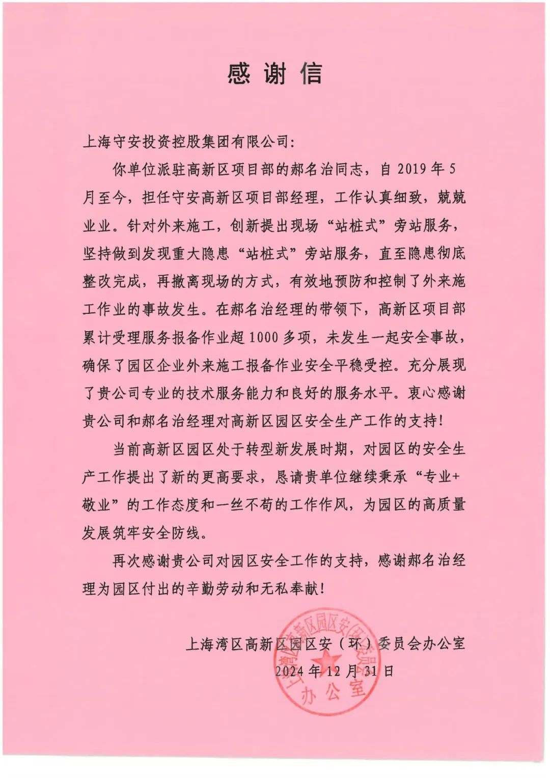 这不仅是对公司团队过去努力的肯定,更是对未来征程的激励与鞭策。我司取得的每一点进步,都离不开社会各界的关怀、信任和支持。上海守安投资控股集团有限公司将一如既往做好安全技术服务工作,守护平安回报社会,不断提升自身实力以提供更为优质、高效的服务,共同书写新篇章。