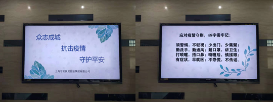 集团前台大屏幕滚动播放疫情防控知识,为员工免费提供防疫手册。设立体温检测台,对出入集团总部办公区域的员工进行体温检测并记录。禁止外来人员进入集团办公区域。每天对电梯和办公区域进行消毒。对使用后纸巾和口罩集中管理,并用高温消毒后再统一处理。