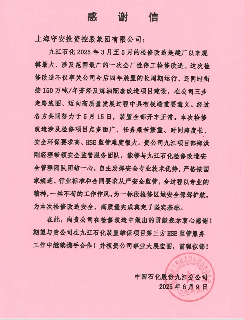 中国石化九江分公司2025年装置大检修改造,安全圆满顺利完成,这也是习近平总书记2023年10月10日视察九江石化以来,学习贯彻习近平总书记重要指示精神实现高质量发展而实施的首次大规模检修改造;在这场历时55天,以九江石化建厂以来规模最大、时间最紧、覆盖面最广、实施难度最高的全面性检修攻坚战中,上海守安投资控股集团有限公司作为检修施工现场第三方监管关键中坚力量,以其专业的安全管理服务为装置检修构筑安全防线,获得九江石化分公司领导高度评价首肯。