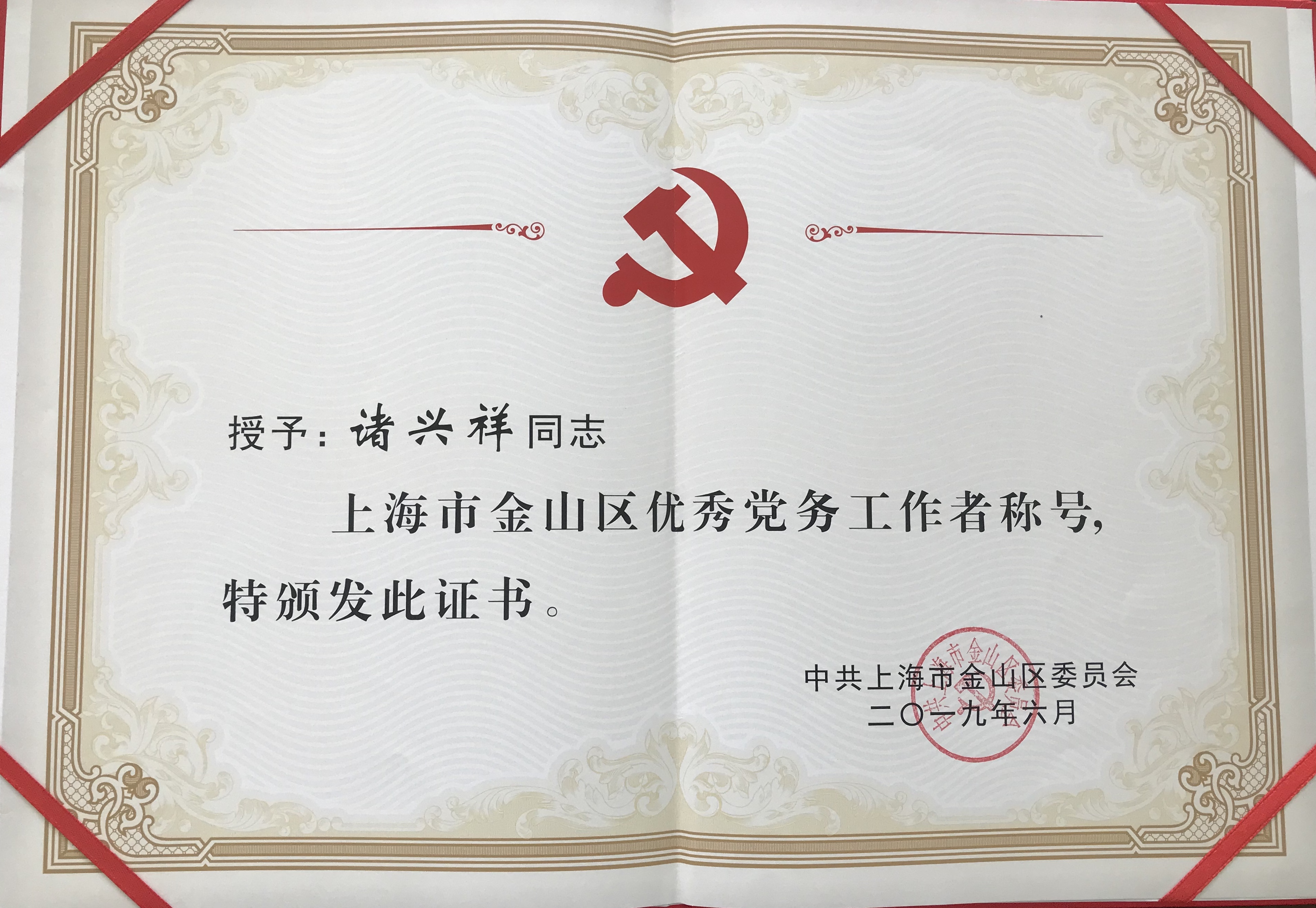 6月26日上午,“学思践悟新思想,不忘初心永奋进”金山区庆祝中国共产党成立98周年座谈会在区会议中心举行,会议表彰了金山区“两优一先”获奖代表,集团党支部副书记、卫东村党总支兼职委员诸兴祥同志荣获“金山区优秀党务工作者”称号。