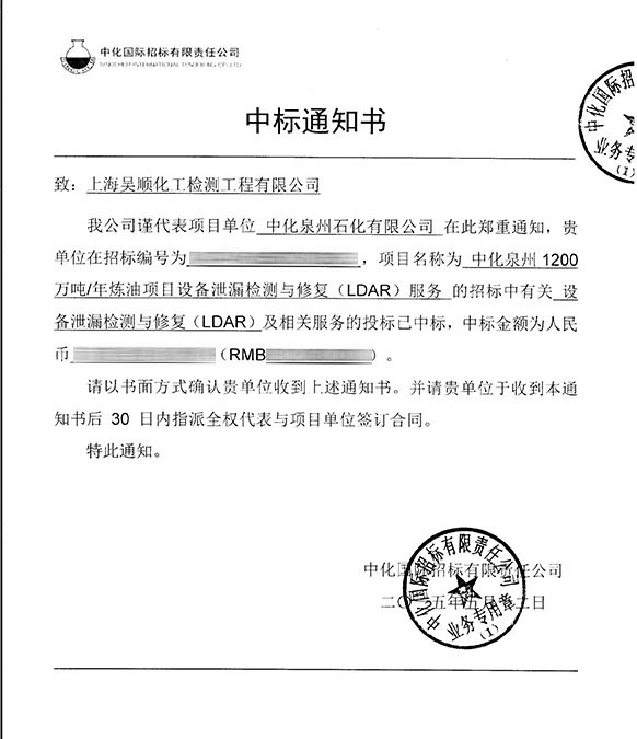 《中化泉州1200万吨/年炼油项目设备泄露检测与修复(LDAR)服务》中标通知书