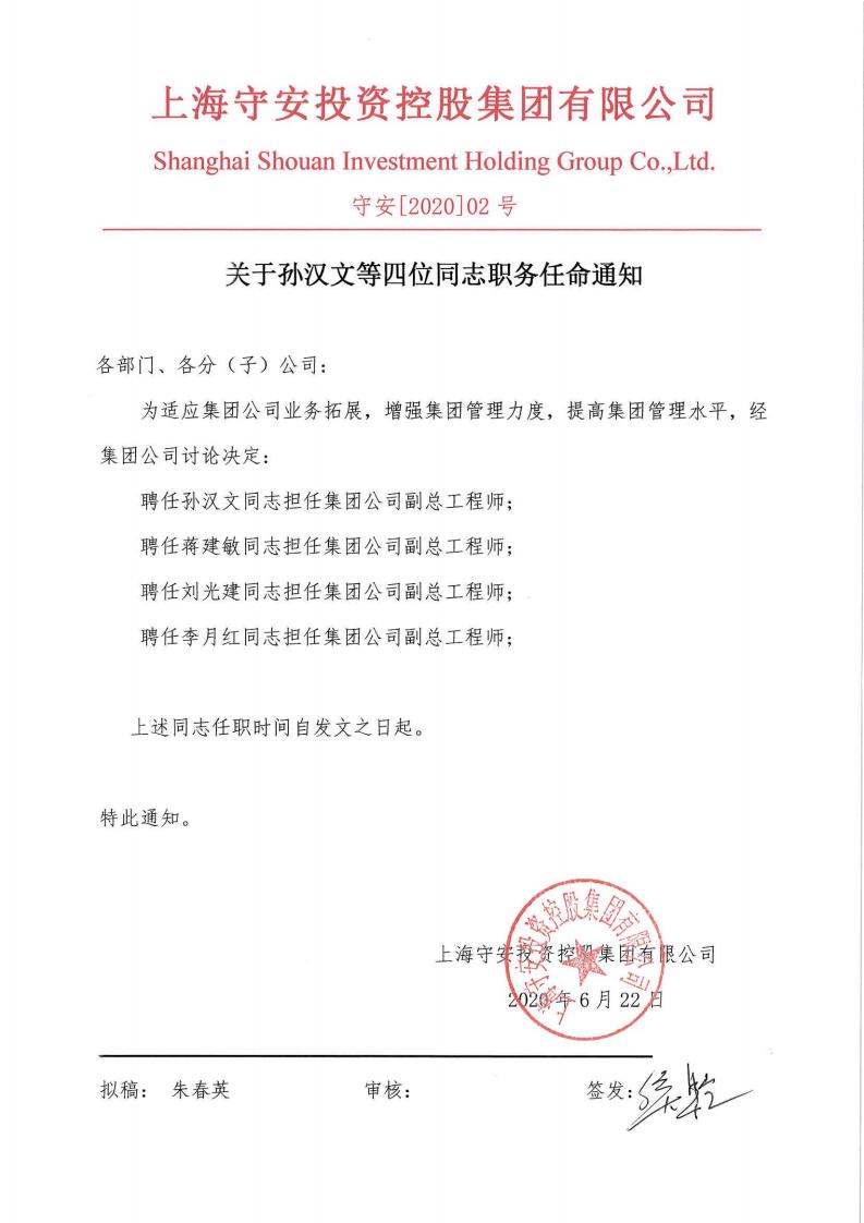聘任孙汉文同志担任集团公司副总工程师;