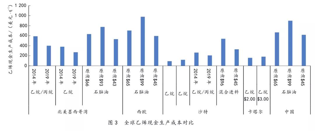从中国乙烯及下游产品、芳香烃 PX 两大化工路线的全球贸易格局来看,尽管国内新增产能规模大,仍无法阻挡全球过剩资源直接或间接流入。近几年美国聚烯烃、乙二醇装置建设较多,在中美达成第一阶段协议之后对中国出口增加明显。中东对中国出口 PX 也是维持增加,而东南亚和东北亚传统出口地区规模出现不同程度减少,日韩和中国台湾省不具竞争力的装置负荷降低。从图 3 乙烯装置现金成本对比来看,中东和北美地区的成本优势巨大是这两个地区保持对中国化工产品出口的核心竞争力。因而,中国不可避免地还将保持一定产品的进口,市场的竞争压力将主要集中在中国及周边国家和地区,尤其是东北亚和东南亚,而国内原料多元化的石化产业将使竞争局面更复杂多变。