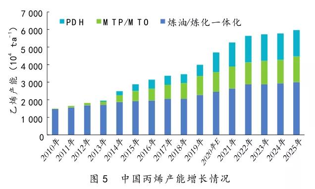 相较于乙烯,丙烯的原料路线更广、多元化发展格局更为复杂。2019 年,丙烯产能为 3989×104t/a,其中 MTP/MTO(甲醇制丙烯/甲醇制烯烃)和PDH 产能分别为 1080×104 t/a 和 635×104 t/a,分别占 27% 和 16% ;传统炼油化工丙烯产能为 2274×104 t/a,占 57% 。2020 年和 2025 年中国丙烯产能预计分别达 4690×104 t/a和 5971×104 t/a (见图 5)。