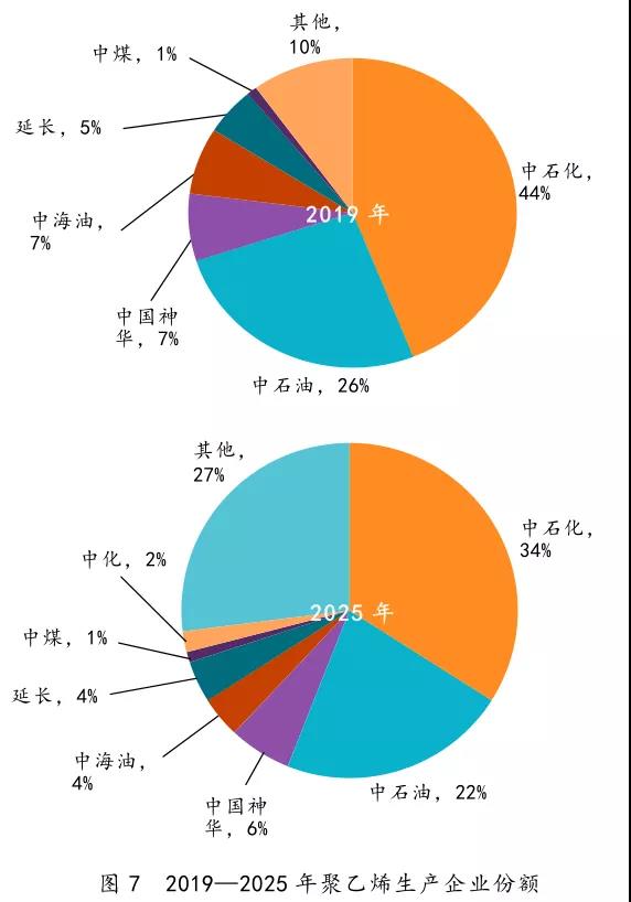 随着以荣盛、恒力、盛虹为代表的国内民营资本及埃克森美孚、阿美、巴斯夫、利安德巴塞尔等国际化工巨头纷纷进入中国石化产业,神华、延长、华锦的不断扩张,未来,中石化和中石油的产能占比还将进一步下降。如聚乙烯的产能占比将从 2019年 44% 、26% 下降到 2025 年 34% 、22% (见图 7)。